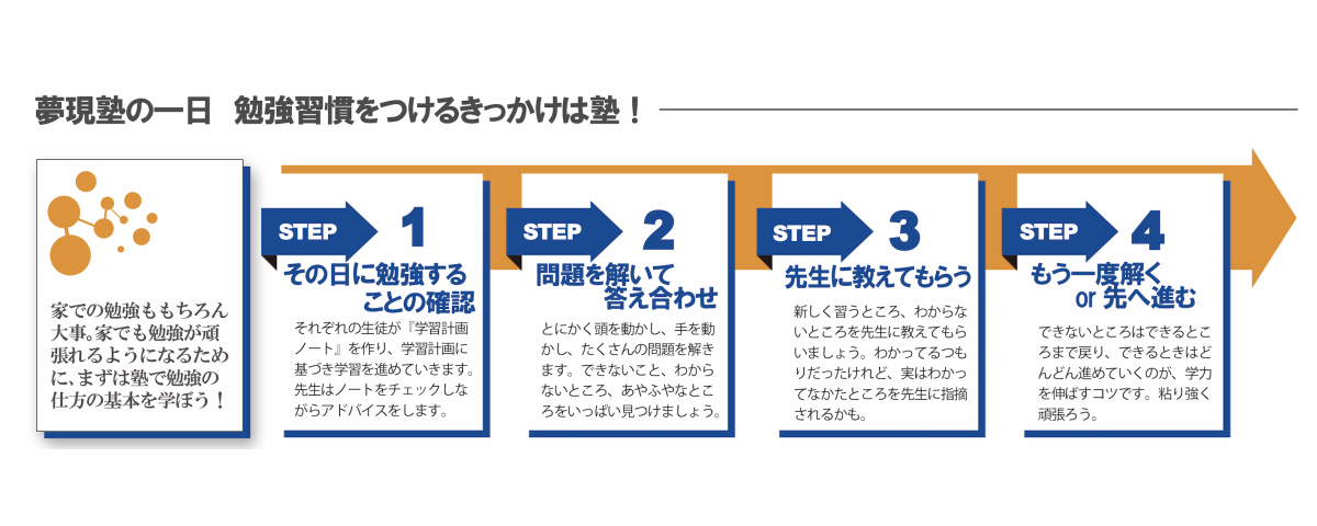 ことを身につけることができません。 夢現塾では、一人ひとりの生徒と打ち合わせながら、学習目標 や課題を決め、塾でがんがん勉強してもらいます。(問題を解いて